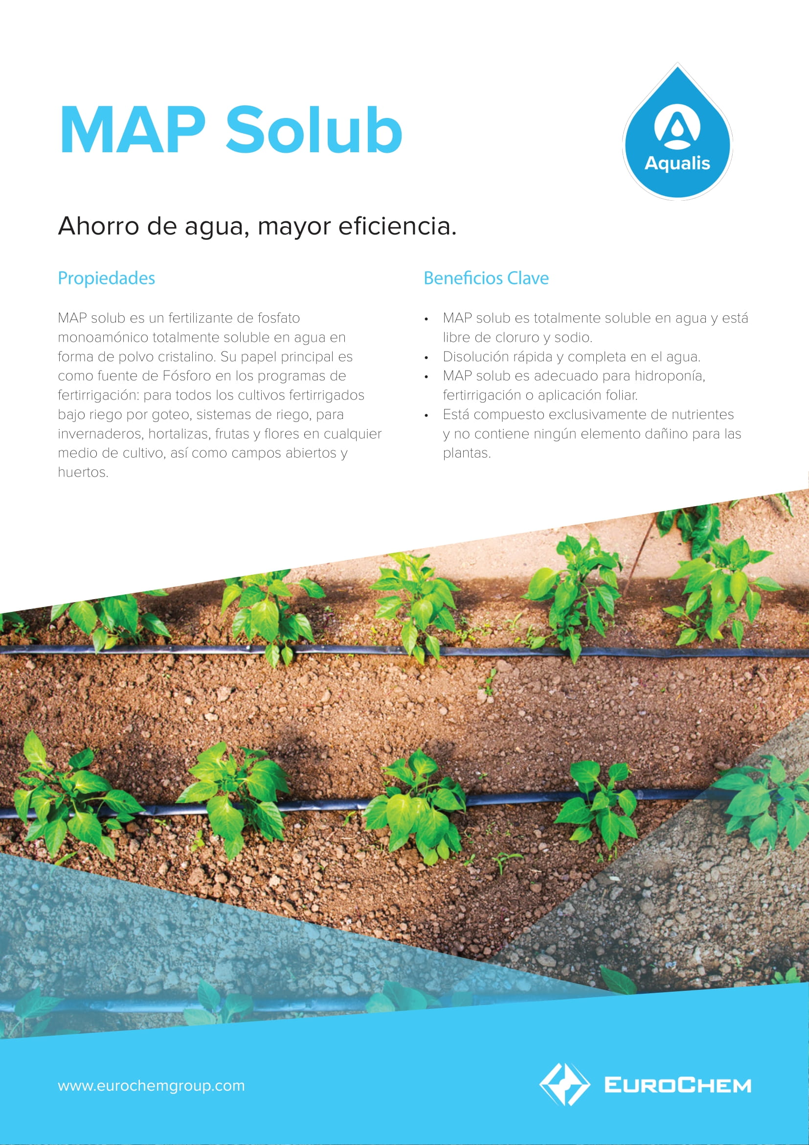 Su papel principal es como fuente de Fósforo en los programas de fertirrigación: para todos los cultivos fertirrigados bajo riego por goteo, sistemas de riego, para invernaderos, hortalizas, frutas y flores en cualquier medio de cultivo, así como campos abiertos y huertos.