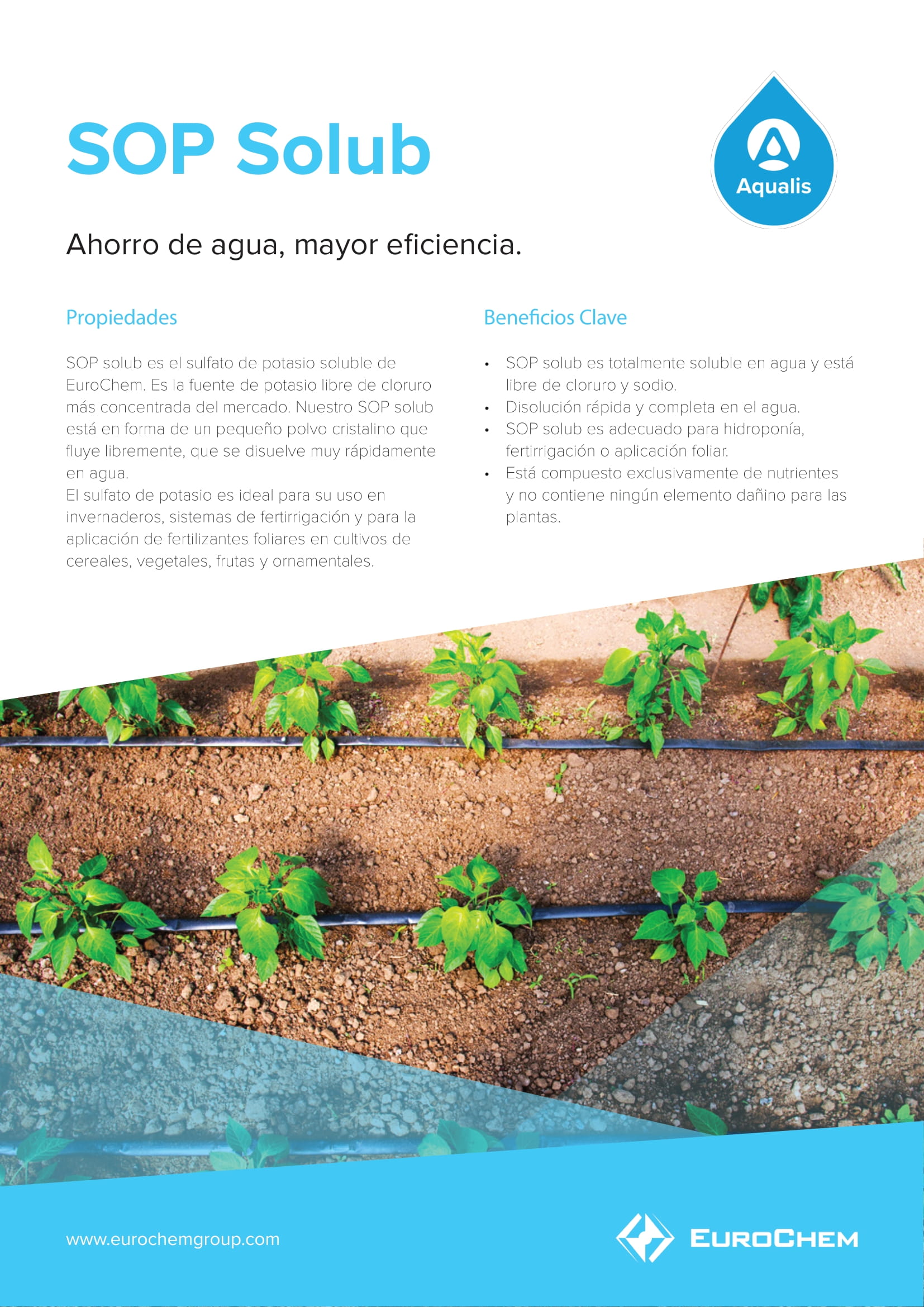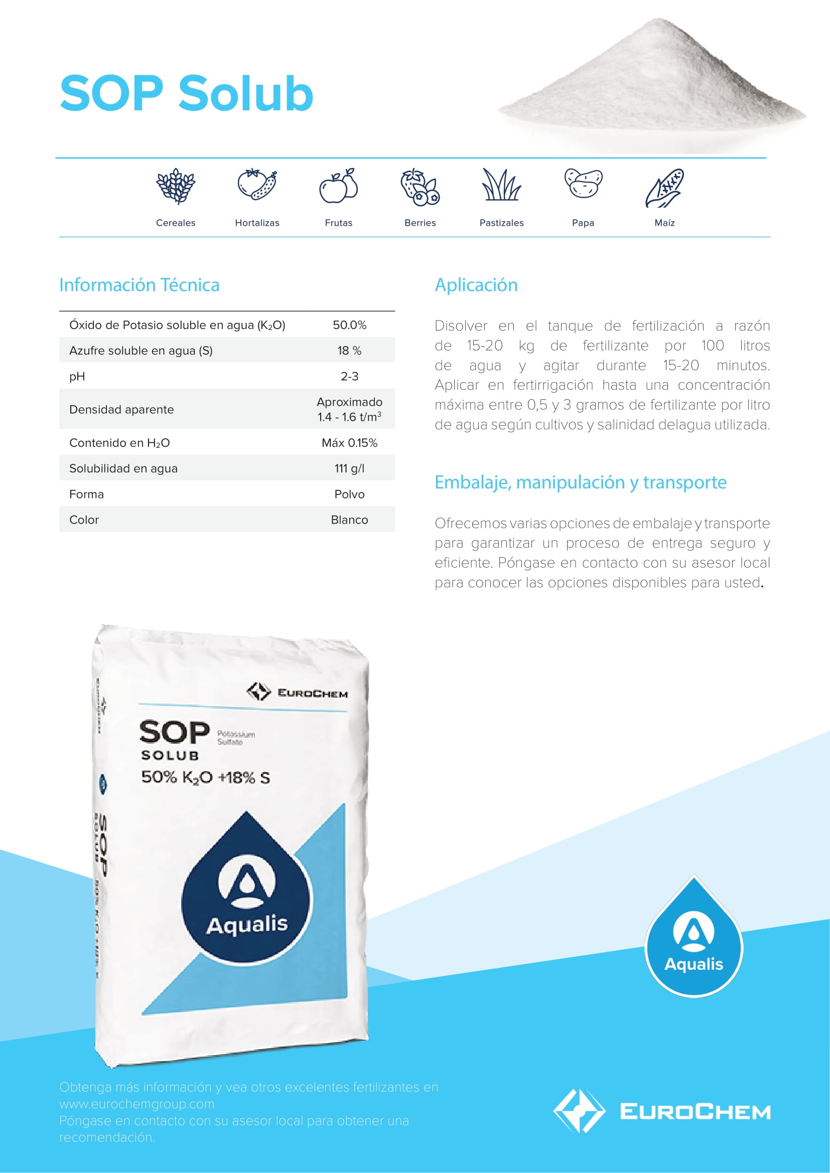 SOP solub es el sulfato de potasio soluble de EuroChem. Es la fuente de potasio libre de cloruro más concentrada del mercado. Nuestro SOP solub está en forma de un pequeño polvo cristalino que fluye libremente, que se disuelve muy rápidamente en agua.