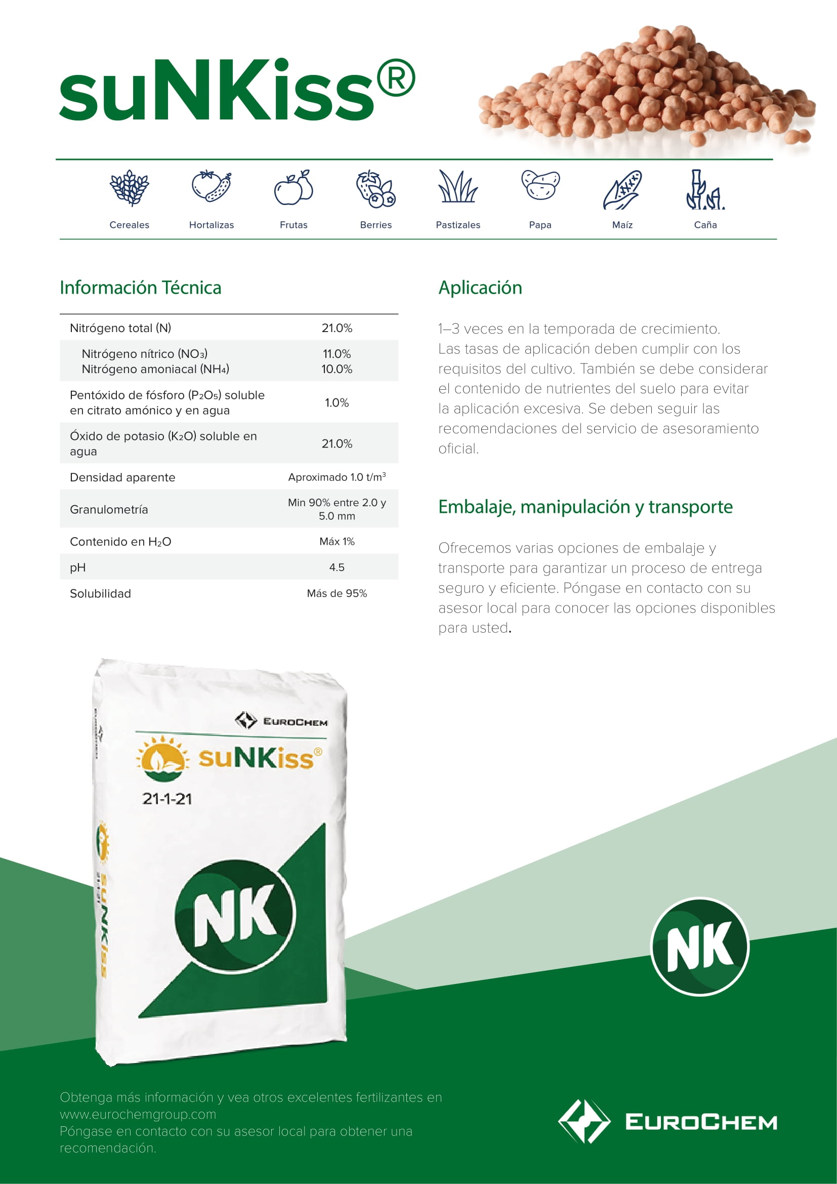 suNKiss® combina la eficiencia del nitrógeno con un suministro de potasio fácilmente disponible. El nitrógeno está presente en ambas formas de amonio y nitrato, asegurando una absorción eficiente, rápida y estable, mientras el potasio es totalmente soluble y completamente absorbido por las plantas.