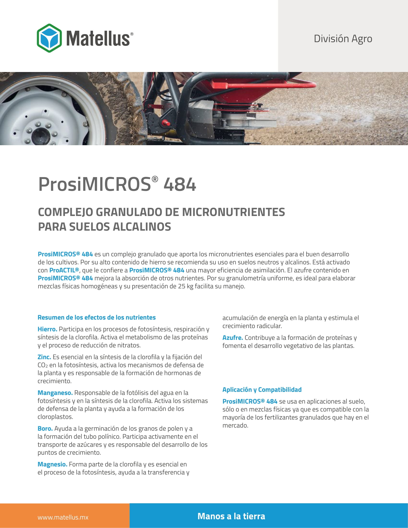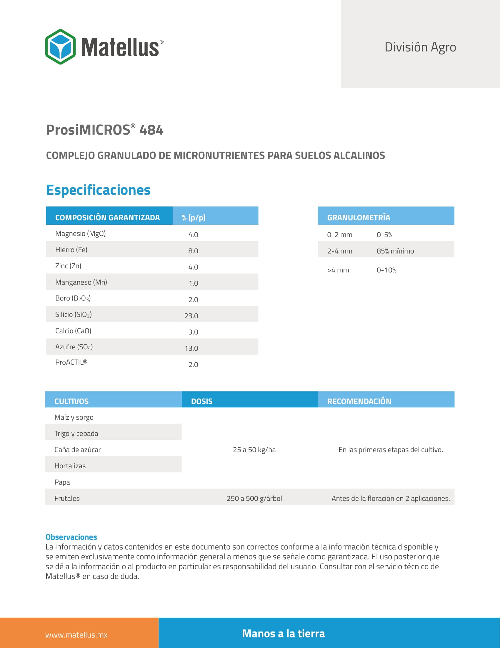 con ProACTIL®, que le confiere a ProsiMICROS® 484 una mayor eficiencia de asimilación. El azufre contenido en ProsiMICROS® 484 mejora la absorción de otros nutrientes. Por su granulometría uniforme, es ideal para elaborar mezclas físicas homogéneas y su presentación de 25 kg facilita su manejo.